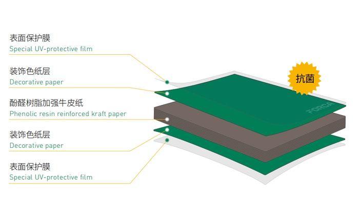 福爾卡·抗倍特板(纖維樹脂板)是由裝飾色紙含浸三聚氰胺樹脂,加上多層黑色或褐色牛皮紙含浸酚醛樹脂層疊后,再用鋼板經由高溫(150° C)高壓(1430psi)的環境壓制而成,產品密度不低于 1450KG/m',厚度從 1.5mm 到 25mm 皆可制作。酚醛樹脂纖維板依其表面色紙層,可滿足多種花色選擇,單面或雙面的裝飾需求。